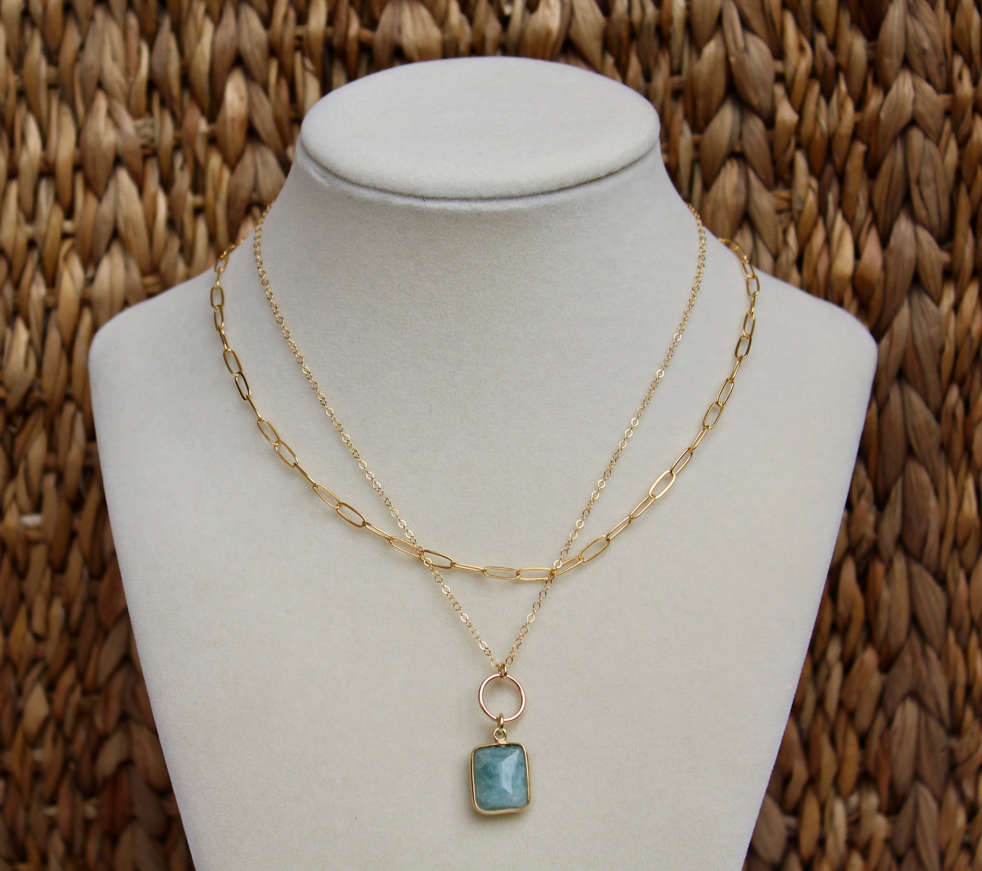 14K gold-filled chain with 10mm square amazonite drop.
